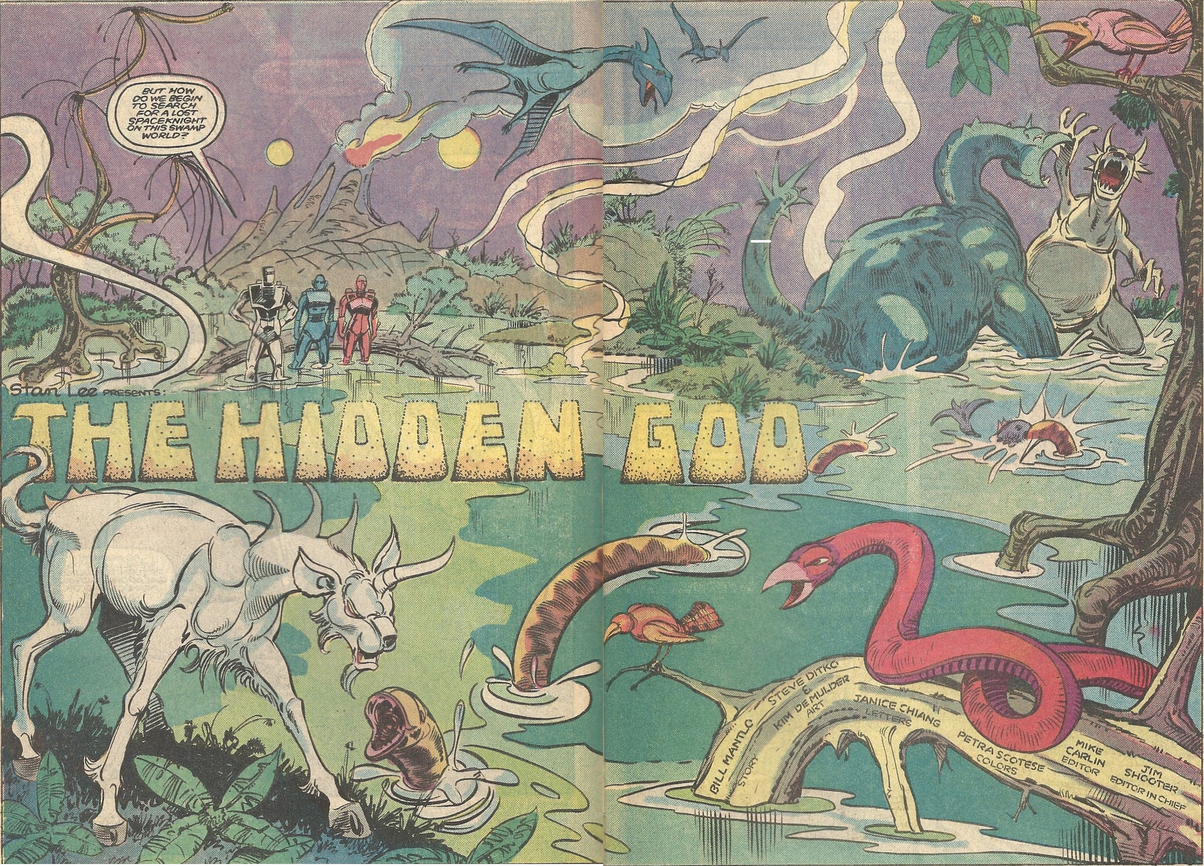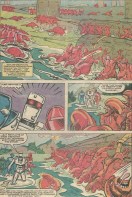 I especially like the two dinosaur thingies squaring off in the upper right corner and the mean looking wolf/unicorn (wolficorn?) in the lower left. (And please note the distinctive water-splashing effects, as highlighted back here.) Our heroes tangle with one of the beasties – another chance for Rom to display his distaste for taking life – and soon are back on the Spaceknight scent.