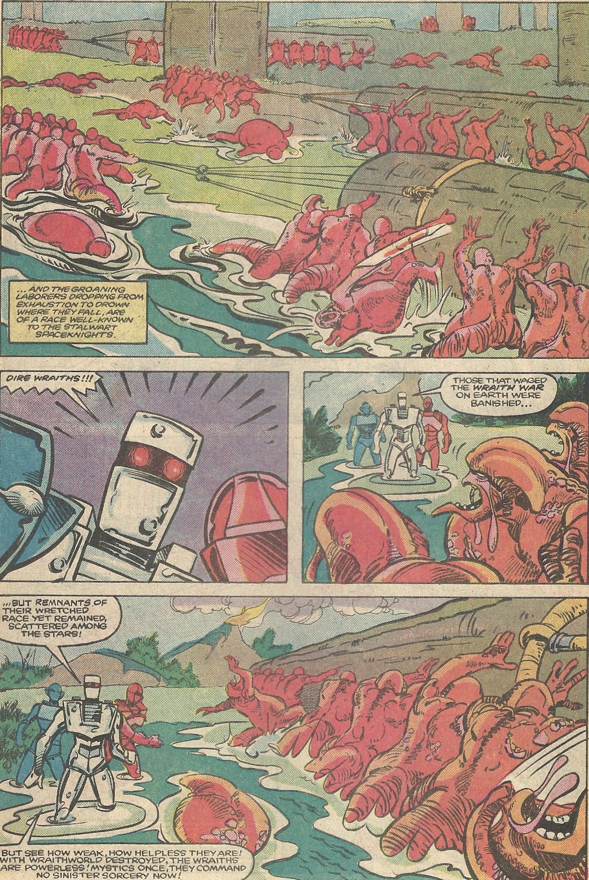 They soon find an improbable sight – enslaved Dire Wraiths laboring in constructing a fortress for the titular “Hidden God.” As Rom asks them what’s going on, lightning bolts strike out from the sky and cut down the powerless Wraiths. The “Hidden God” speaks to the Spaceknights and tells them to enter the temple at the center of the under-construction fortress. There they discover the Wraith master – Unam the Unseen, the Spaceknight that they were looking for.