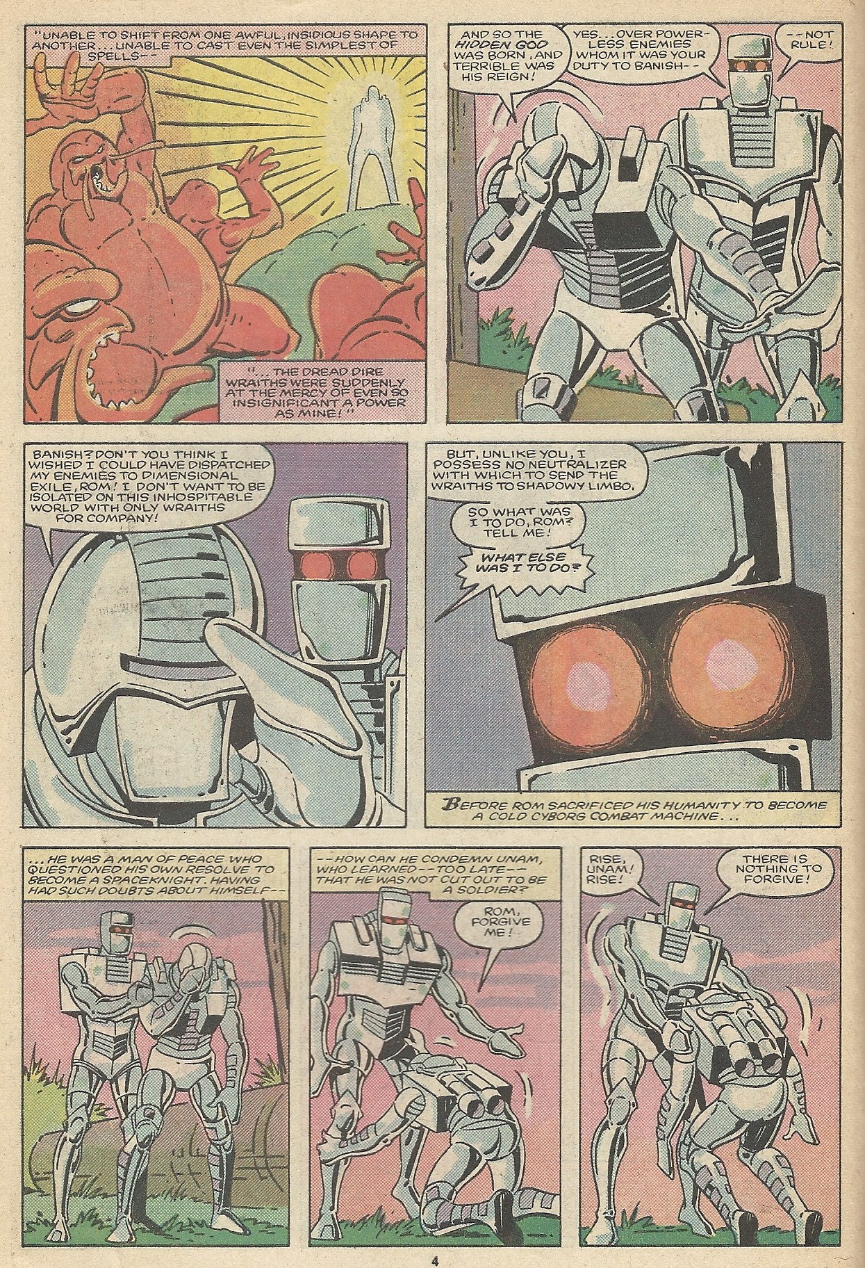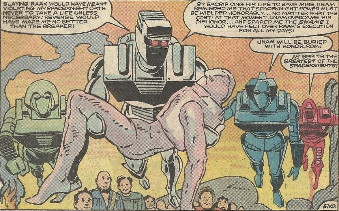 Rom, moved by Unam’s final noble act, uses his Neutralizer to banish Raak to Limbo – there he can rot for eternity with his fiendish partners. Rom and his comrades are left to contemplate Unam’s sacrifice: