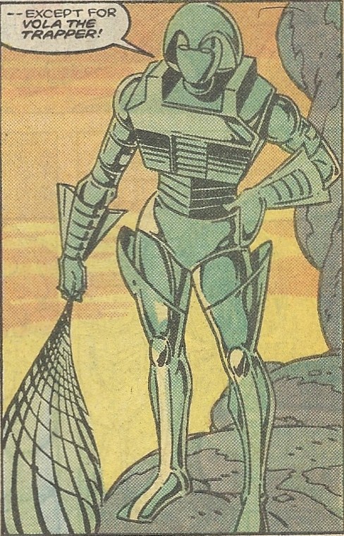 Back to our Spaceknights. Once again Scanner detects – you guessed it – Spaceknight signals from a nearby world, and they go to investigate. They fend off a half-ass ambush by simple humanoids, and it’s revealed that those humanoids are led by a Spaceknight, Vola the Trapper:
