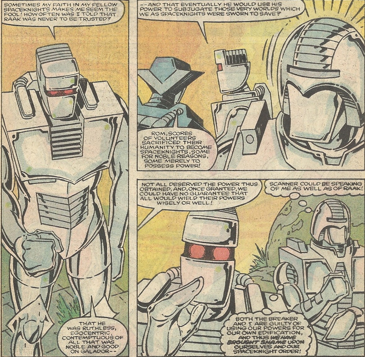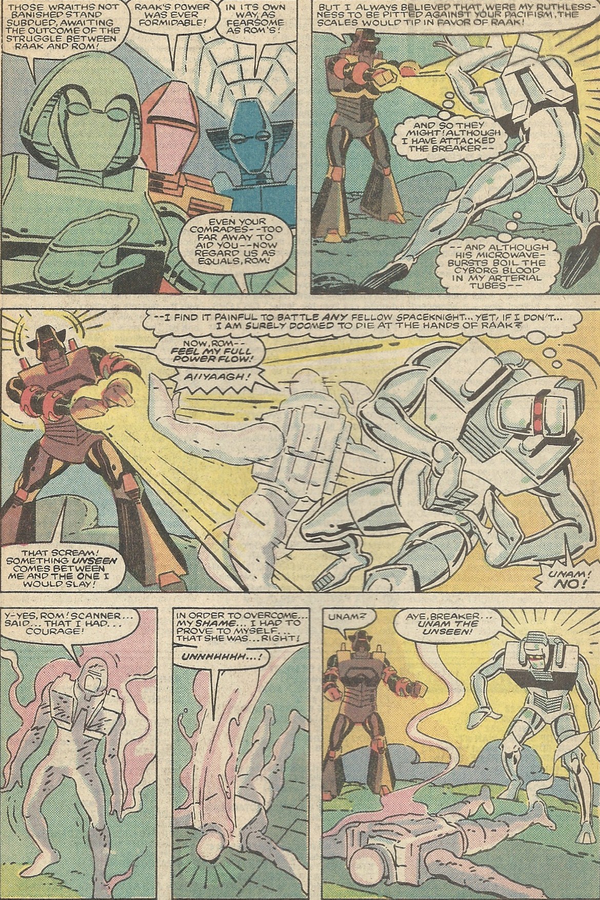 Vola has been aiding the Clavians in their fight for freedom. All this gets Rom worked up into a righteous anger, and the Spaceknights along with Vola and her Clavian allies attack Raak and his minions. They open the proverbial can of whoop-ass, including Unam, who’s bucked up when Scanner tells him “there is still something of the hero inside you.” Finally it comes down to a mano a mano tangle between Raak and Rom. Raak gains the upper hand, mainly because of Rom’s reluctance to harm another Spaceknight, though Raak’s powerful “microwaves” play a part – I guess that “The Breaker” isn’t an honorary title. It seems that Rom might actually get himself fried, but in steps our Unam ex Machina:
