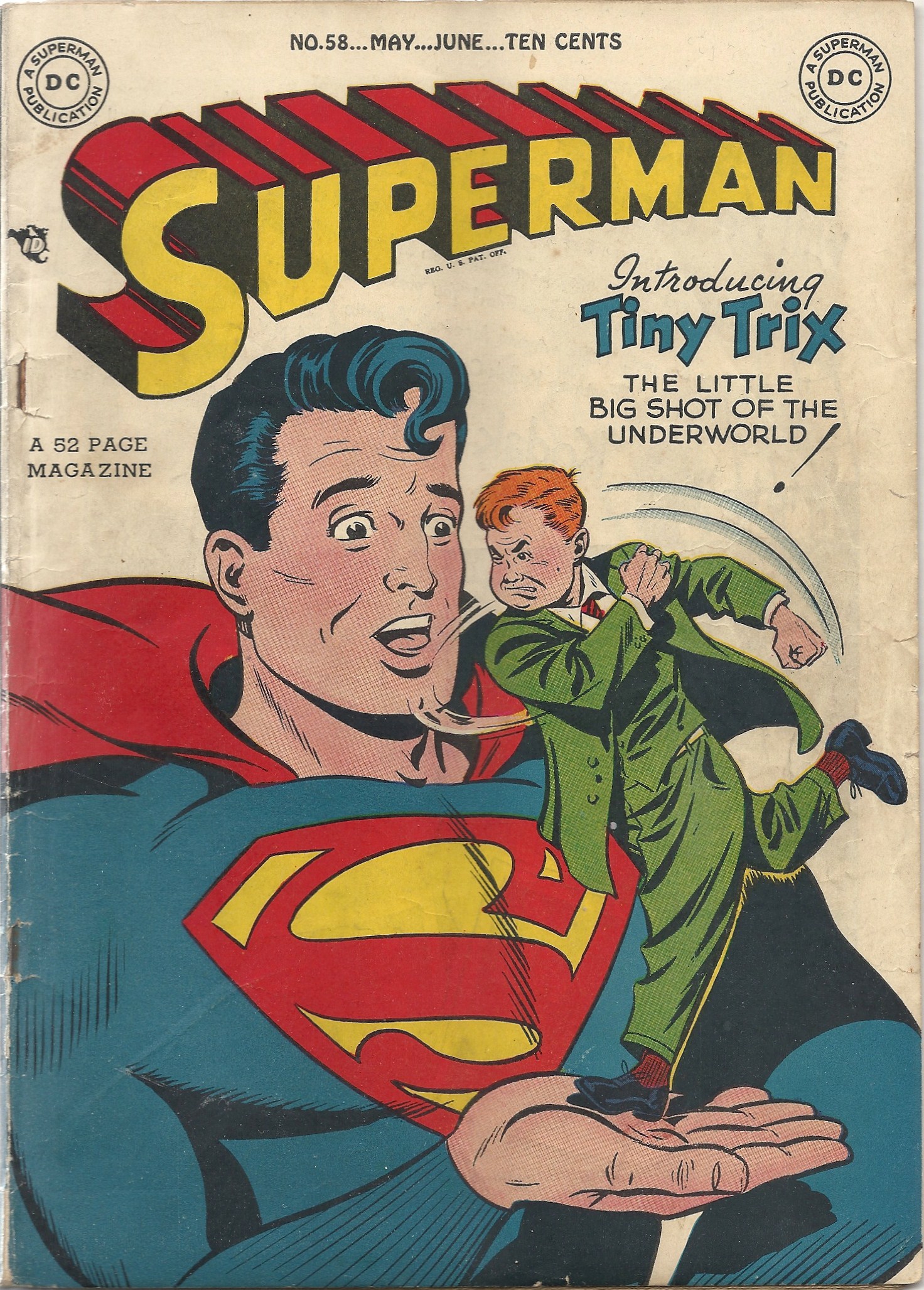 I’m not nuts about Golden Age comics in general, but I will say this for them – you certainly got a lot of bang for your buck back in the day. This issue has not one, not two, but three Supeman stories inside. Not bad for a dime. The first, Tiny Trix, the Bantam Bandit, deals with the miniature James Cagney on the cover. A comedic story, Superman catches a miniature crook, the crook pretends to be a kid to get released from prison, and then Superman has to recapture him. The second, Lois Lane Loves Clark Kent, features Lois as she follows a doctor’s orders to try and give up her crush on Superman. She transfers her Single White Female-esque obsession with Supes to Clark (seriously, Lois has issues), and our hero has to escape her clutches so that he can remain free to fight crime. The last, The Case of the Second Superman, follows the adventures of a hero on another planet who asks Superman for help.