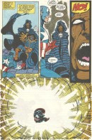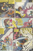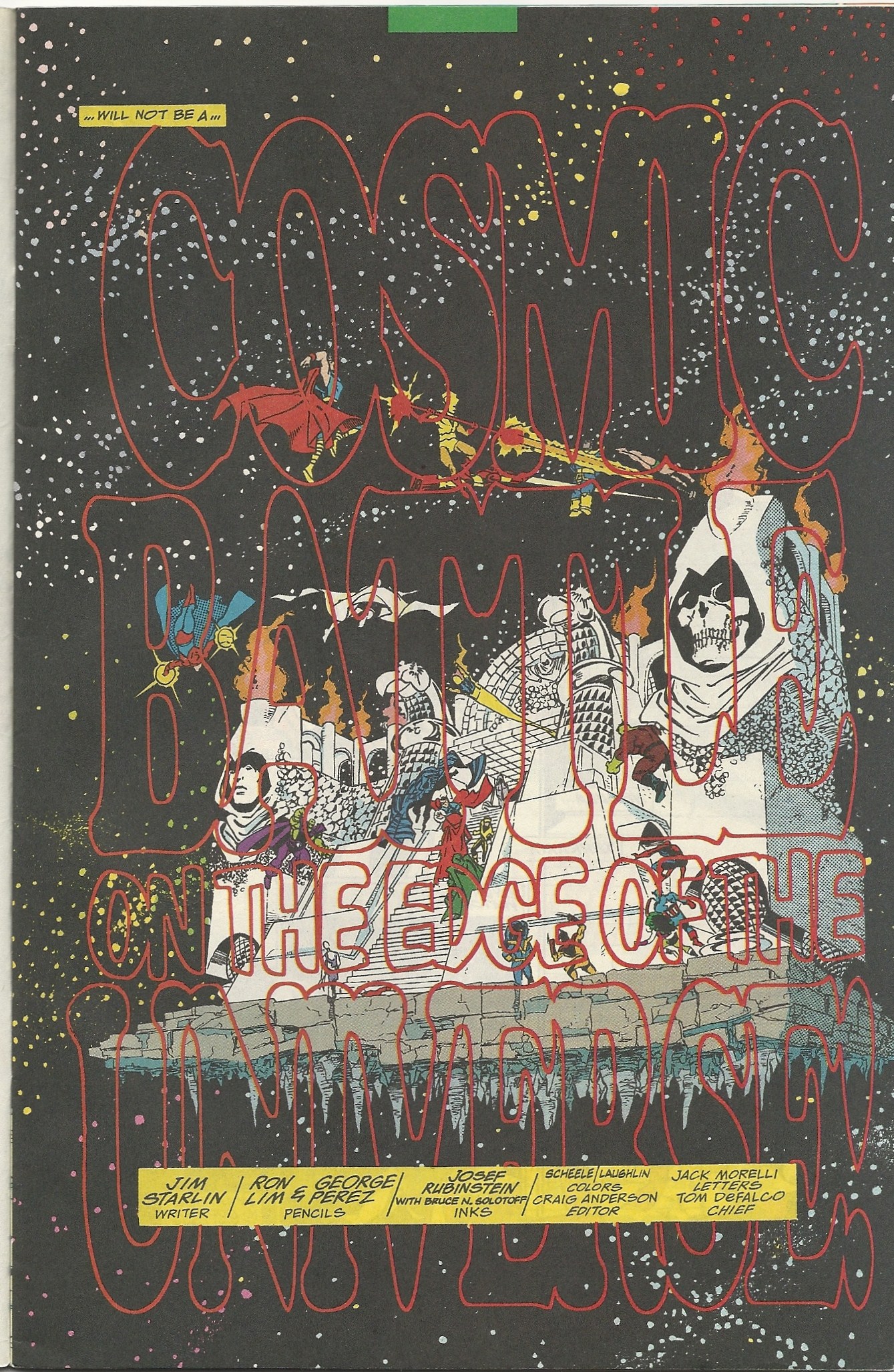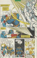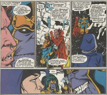 Also, this issue was odd creatively. Jim Starlin wrote the series and George Perez started out as the penciller, but halfway through this issue he was replaced by Ron Lim. You’ll see the change after the first couple of scans that I posted above. I think I remember reading somewhere that Perez became ill and that it wasn’t any sort of creative disharmony that prompted the replacement. Still, it’s not very common for that sort of mid-issue handoff to happen.