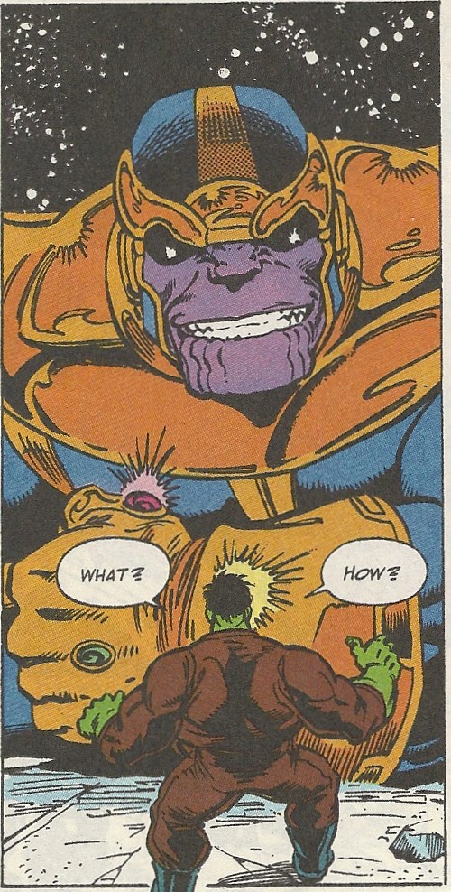 Thor clobbers Thanos with his hammer, but Doctor Doom (Warlock shouldn’t have trusted him), instead of finishing him off, tries to get the Gauntlet for himself. He pays the price:
