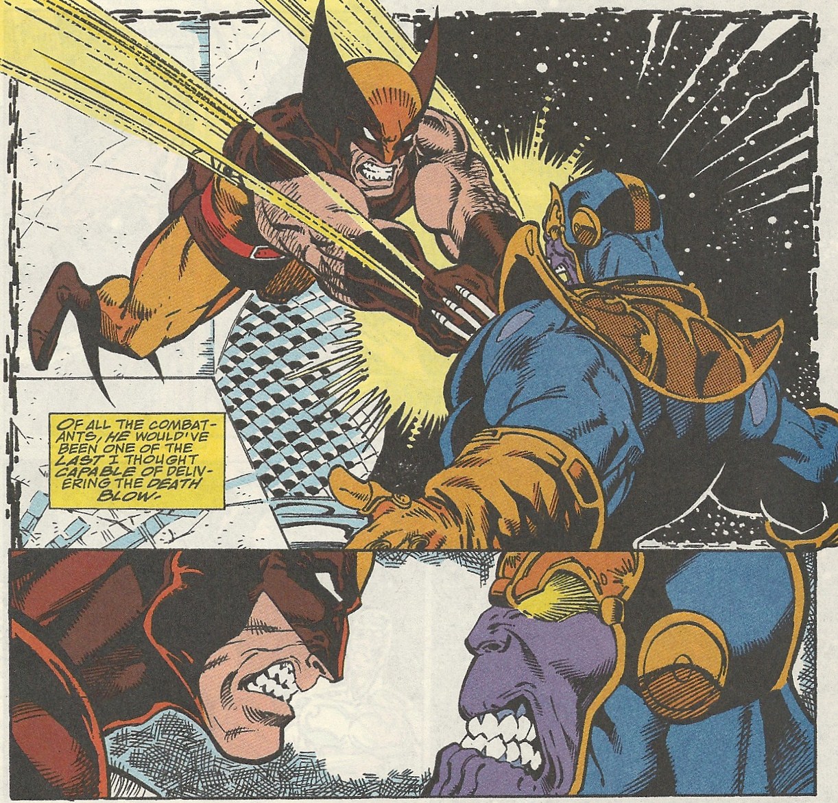 Next we have Quasar facing Thanos in a Leone-esque showdown. Surely the heir to Captain Marvel will put up more of a fight: