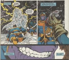 Thanos promptly freezes the heroes in time and contemplates what to do with them, but Mephisto, now a mere lackey to a vastly more powerful being, uses Thanos’ devotion to Mistress Death to clandestinely give the heroes a chance at victory. I guess he doesn’t like being second banana, and those devils can be oh so tricky: