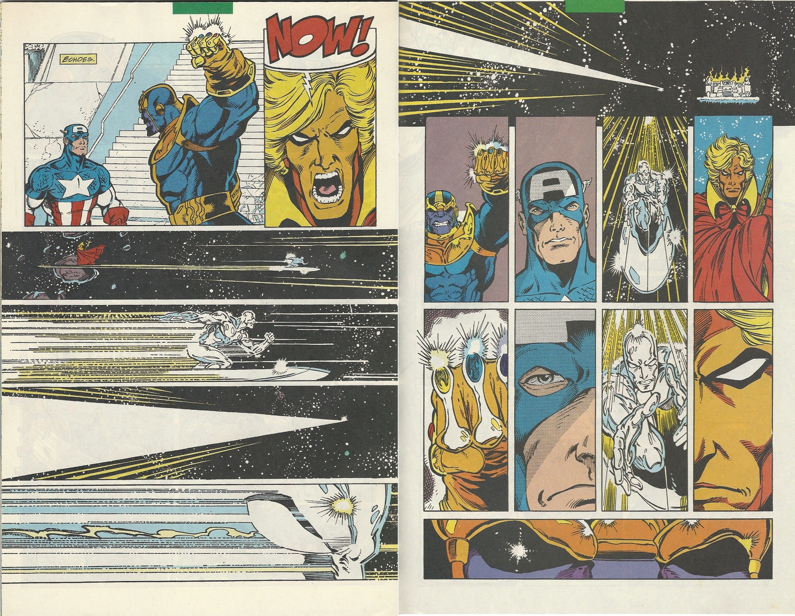 But wait — remember the Surfer and Warlock? The Surfer’s been chomping at the bit, desperate to help in the fight, but has been held back. Now we know why. Warlock’s big plan has been to distract Thanos, to hope that he focuses on the combat, on what’s in front of him, and that he fails to notice the Surfer as he swoops in and rips away the Gauntlet. I love what artist Ron Lim did with this two-page spread — I always have the tension music from the old Star Trek shows in my head when I see it: