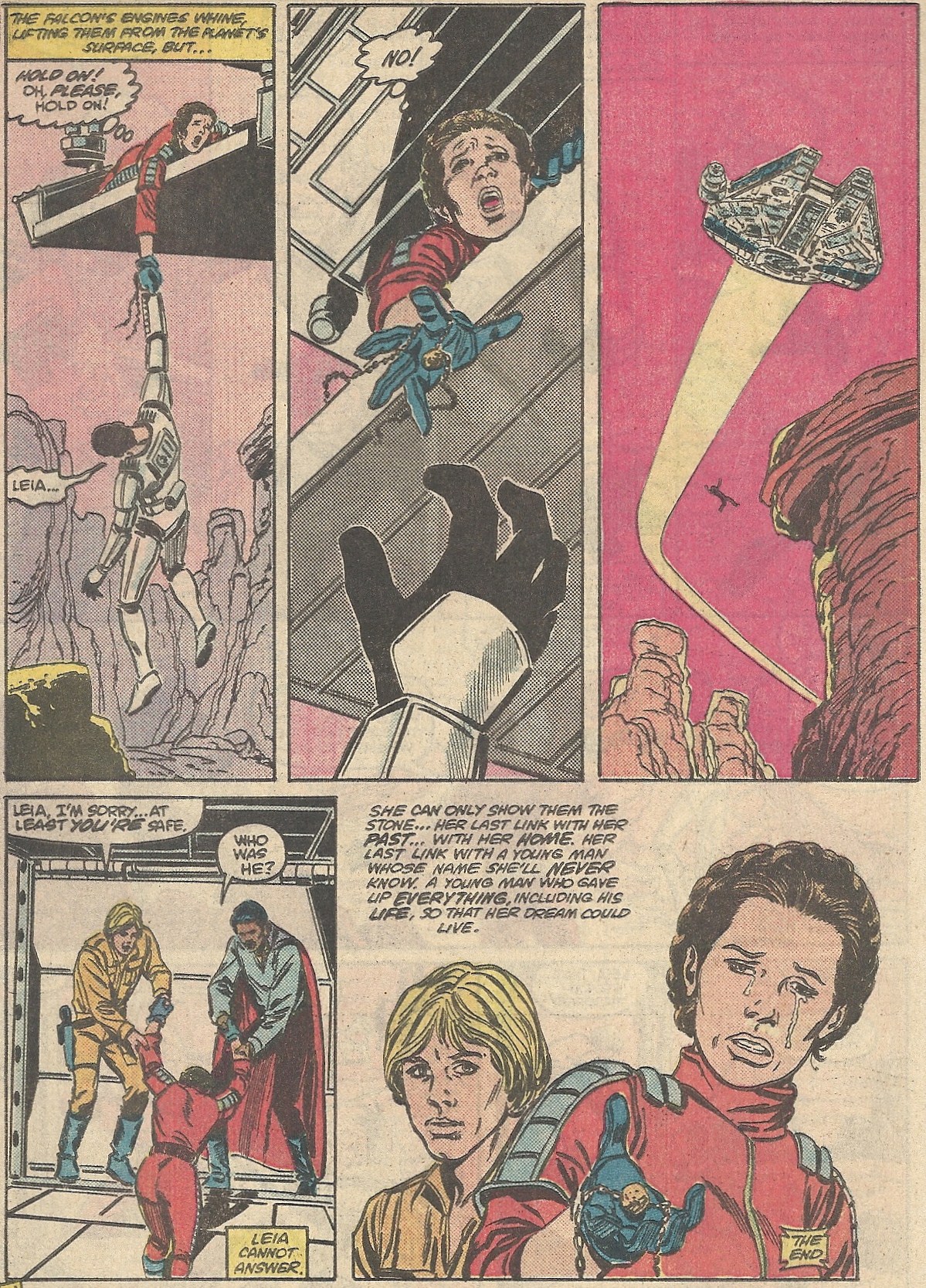 Along the way they start to understand each other a little better, bonding over a small chunk of rock from Alderaan that the Stormtrooper wears on a necklace, but the nameless soldier nevertheless turns her over to his Empire superiors. When Luke and Lando show up in the Millenium Falcon to rescue her, he has a change of heart (reminiscent of Darth Vader at the end of RotJ) and helps her get to the ship. He’s shot in the back and falls to his death as the Falcon makes its escape in a reversal of the above-pictured rescue: