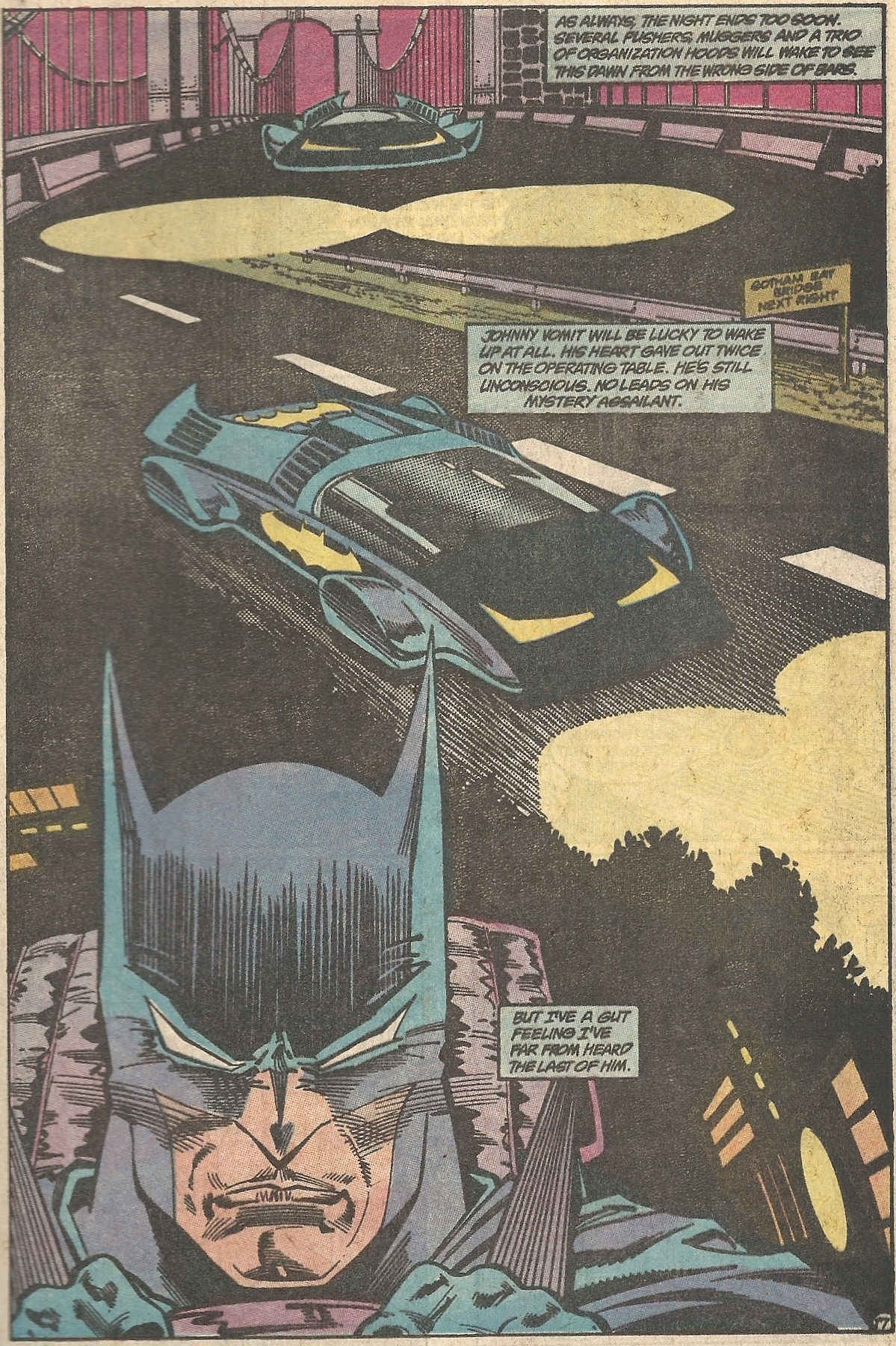 Anarky confronts a drug-dealing punk rocker and uses his weapon of choice, a long staff with a taser on the end, to electrocute the guy (his other weapons are a red can of spray paint for his “A” graffiti and his limitless loquacity).  This crime gets the attention of the Caped Crusader, and he ruminates on the situation in this full-page spread (and check out Breyfogle’s sleek Batmobile design):
