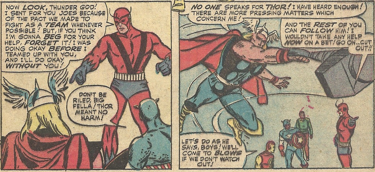 Stand thee back, stalwart fellows, whilst Thor smashes our problems with his mighty hammer! – The Avengers #12