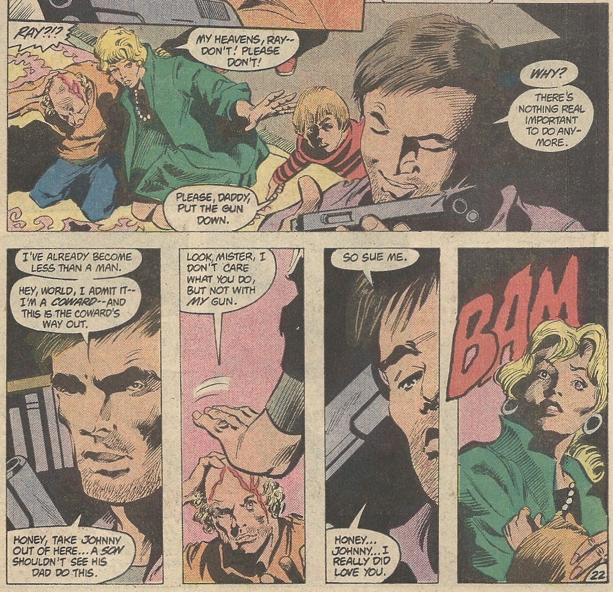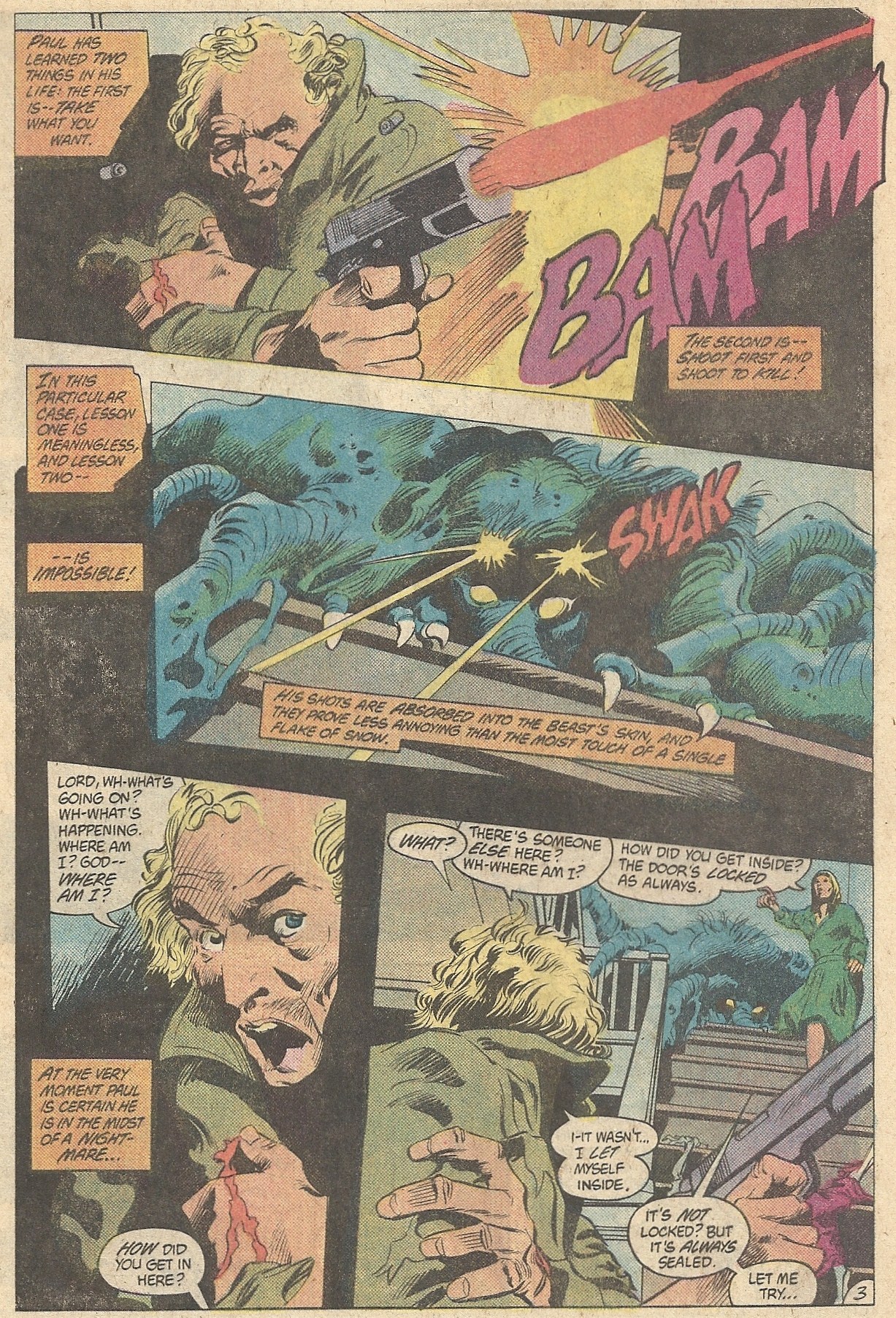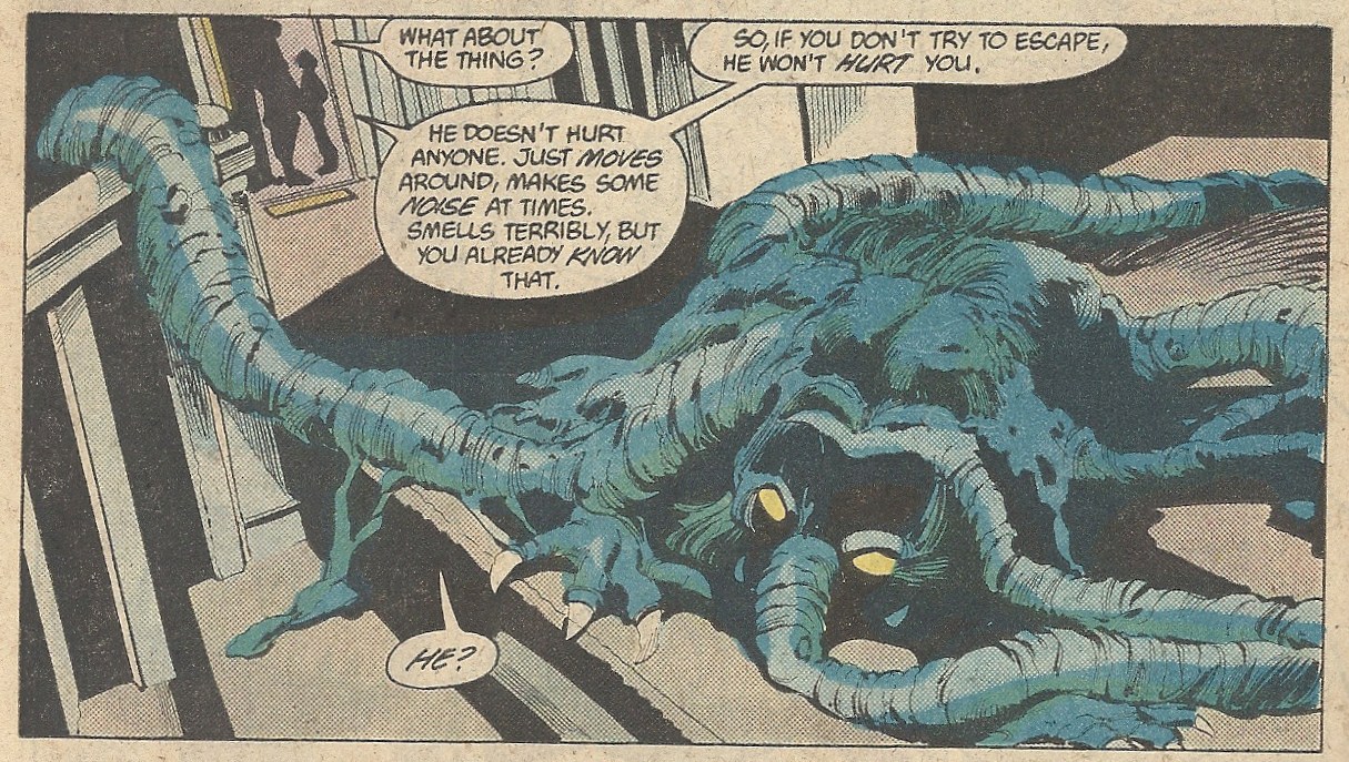 Well…I kind of dig this book. There’s a mystery to the origins of this creature that I really like. There are some allusions in this issue to it having done similar things on other worlds to other sentient species, but its motivations are unknown throughout. Add to that its gobbling up of dead bodies and crapping out bones, which is a nice disgusting touch. Colan’s shadowy artwork has always been well-suited for horror, and that’s on clear display here. And a mentally shattered father blowing his head off in front of his wife and son — I think that qualifies as harrowing.