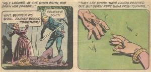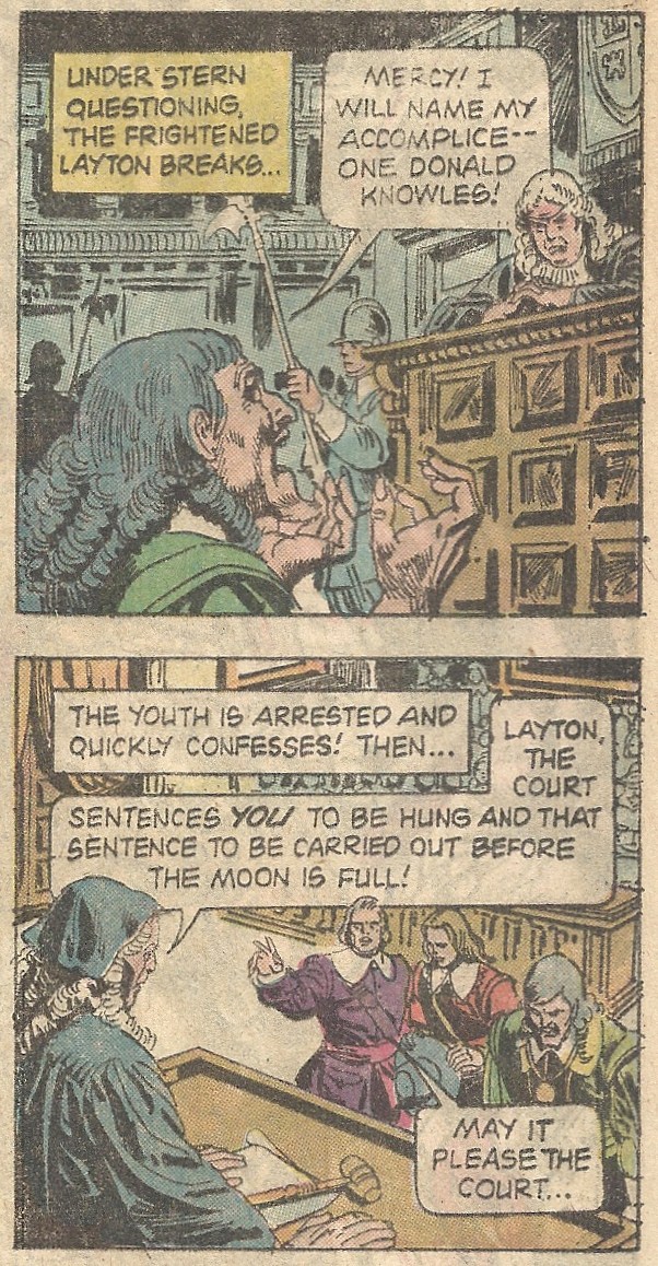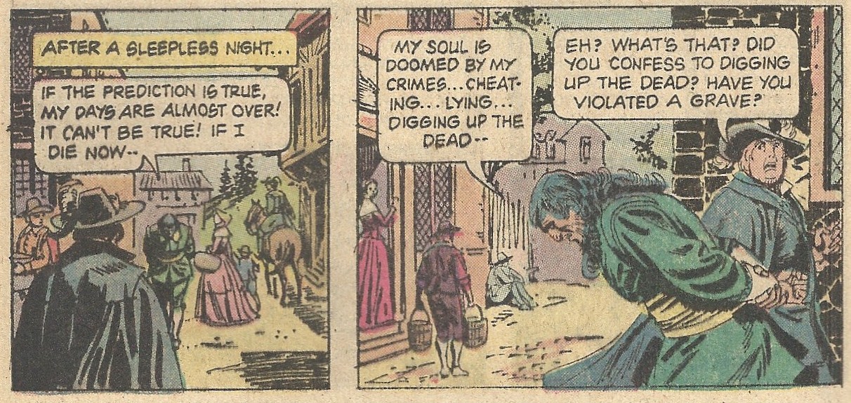 “The Day You Die!” (Jose Luis Garcia-Lopez) is our last story. The foppish son of a wealthy 17th century nobleman wants to know when his father will die and leave him his inheritance. The magician (Layton) whose counsel he seeks informs him that they’ll have to rob a fresh grave to get answers, and the young man reluctantly tags along. Things get all fouled up when the exhumed spirit gets pissed and, instead of relaying the date of death for the wealthy lord, informs Layton that he (Layton) is going to die in a matter of days. Well played, “magician.”