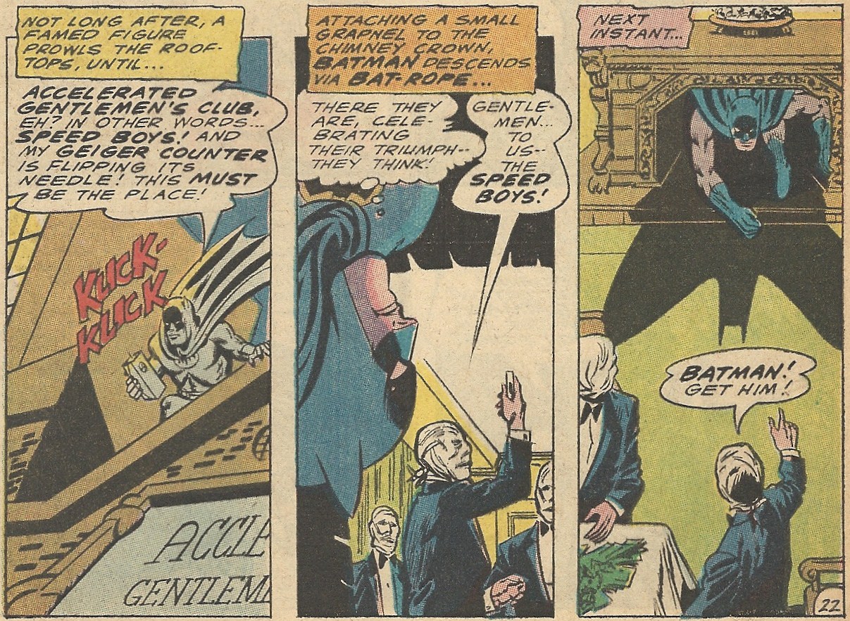 I learned in my brief research of this issue that it marked the beginning of the long run of Batman team-ups in the title. And, in light of this issue’s publication date of August/September 1966, I was a little shocked by the cover puffery having Flash and Batman teaming “for the first time.” I guess without others around them, that’s true. Let’s not get too picky.
