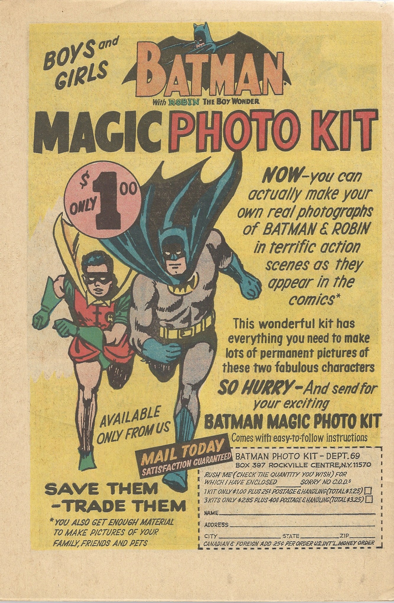 Did anyone out there ever actually own one of these? I pulled this ad out of an old Silver Age book and then did some perfunctory research on the web, but I wasn’t able to find much of anything about this “Photo Kit.” I’m just wondering what they heck it was. For some reason I’m picturing one of those PAAS Easter egg decorating kits, but with pictures. I’m likely way off base with that. Or maybe you could paste Batman and Robin onto family photos crazy-stalker-Single-White-Female-style. Again, I’m likely wrong.