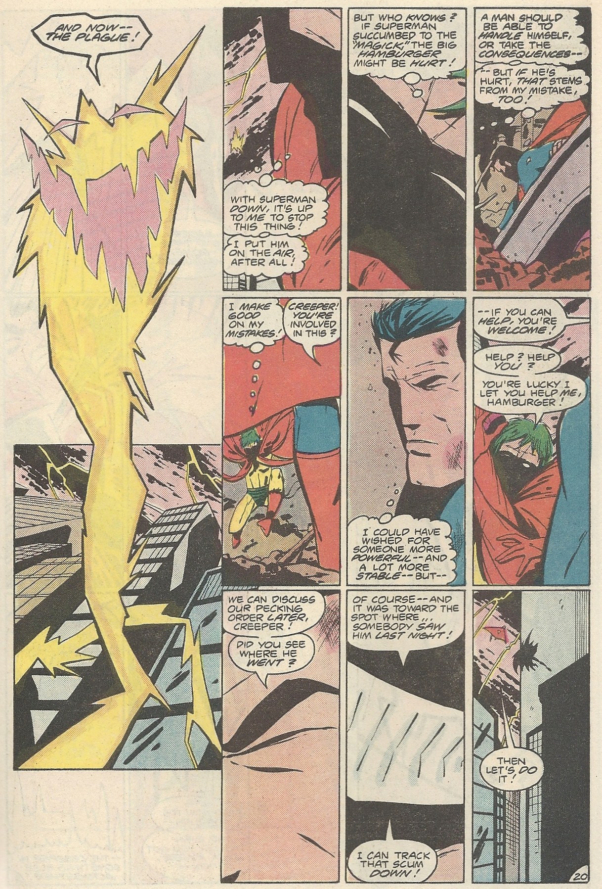 Long story short, some discovered runes release a demon that uses the airwaves to infect humans, and Superman and the Creeper both spring into action to fight it. Supes takes a hit early on, and he’s forced to team up with a, how shall we say, unstable ally: