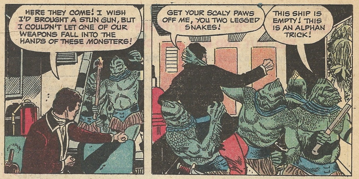 The second story, “Escape from Vipon,” has most of the crew held captive by evil lizard people who look a lot like the Gorn from Star Trek. They want weapons in exchange for their hostages, but the remaining Alphans aren’t going to oblige. You see, they have a plan. First, one of them allows himself to be captured while uttering a Charlton-Heston-in-The-Planet-of-the-Apes inspired epithet, while Maya (fitting in quite nicely with her new crewmates) masquerades as that red cannister behind them: