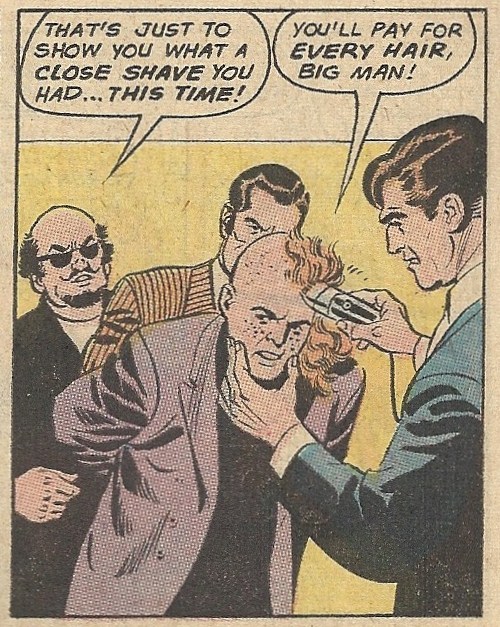 Superman tells Jimmy that he’s on his own with this case (maybe he’s a little peeved at being Jimmy’s personal Orkin man), and young Olsen soon finds himself in over his head and abducted by the slumlord’s thugs. Speaking of heads, they wreak the ultimate indignity upon him: