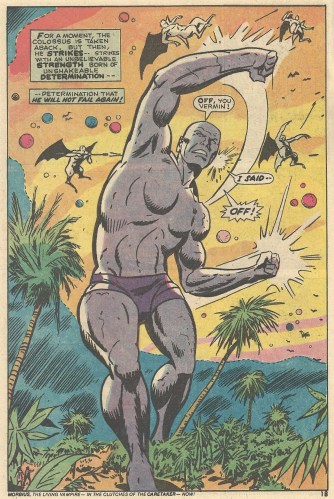 The Living Colossus had a short run in Astonishing Tales. It’s the story of a paralyzed man, Bob O’Brian, who, through mind transference, can inhabit and animate the body of a giant stone statue. There’s little to make it all that unique, but it has its moments.