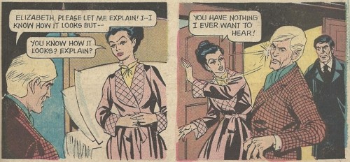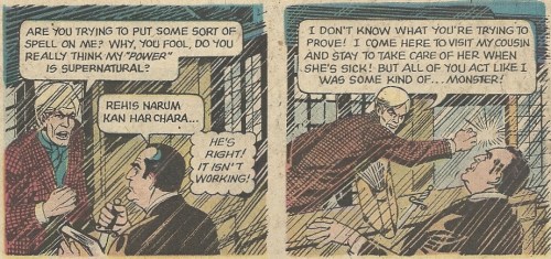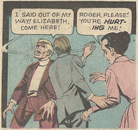 I find many Gold Key comics to be on the stiff side, and this one is no exception. I did, however, derive a degree of pleasure from the repeated pimp slaps doled out from beginning to end. The action in “The Visitor” centers on the return of an old flame/friend of Elizabeth Collins, a cousin (eww) named Damon Coldclaw. Sounds trustworthy enough, right?
