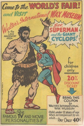 A couple of months ago I posted a random ad that for an old World’s Fair exhibit that depicted Superman battling a big hairy cyclops. Here it is:
