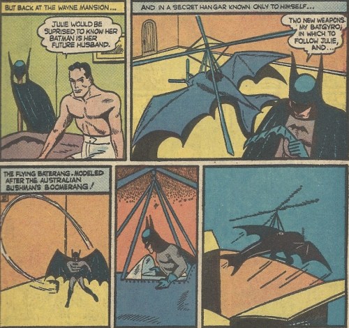 The theme of this collection seems to be the introduction of various trademark devices into each hero’s arsenal, and in Batman’s case we have a double dose. Called “Menace of the Monk” and “Showdown with the Monk” here, this two-part story, from Gardner Fox, Bob Kane and Shledon Moldoff, was originally entitled “Batman vs. the Vampire” and was published in Detective Comics #’s 31 and 32. It features the debut of the Monk and is filled with old old old-school Bat-things like a pipe-smoking Bruce Wayne and a fiancee, but its primary importance is the debut of the Batarang and a pecursor of the Batwing — here’s their first appearances: