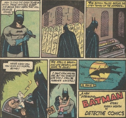 A delightful gothic adventure ensues, and Batman squares off against the hypnotic powers of the Monk and some vampires and manages to rescue a kidnapped Julie, his aforementioned fiancee (that didn’t pan out, did it?). I found the events on the last page, after Batman melts down a silver statue to make some special bullets, to be rather startling: