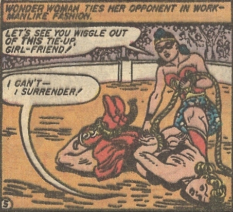 Lest we think that only Amazons behave thusly in a Wonder Woman story, there’s also the Nazi bitch villainess, who tests her invisibility ray in a most unique manner: