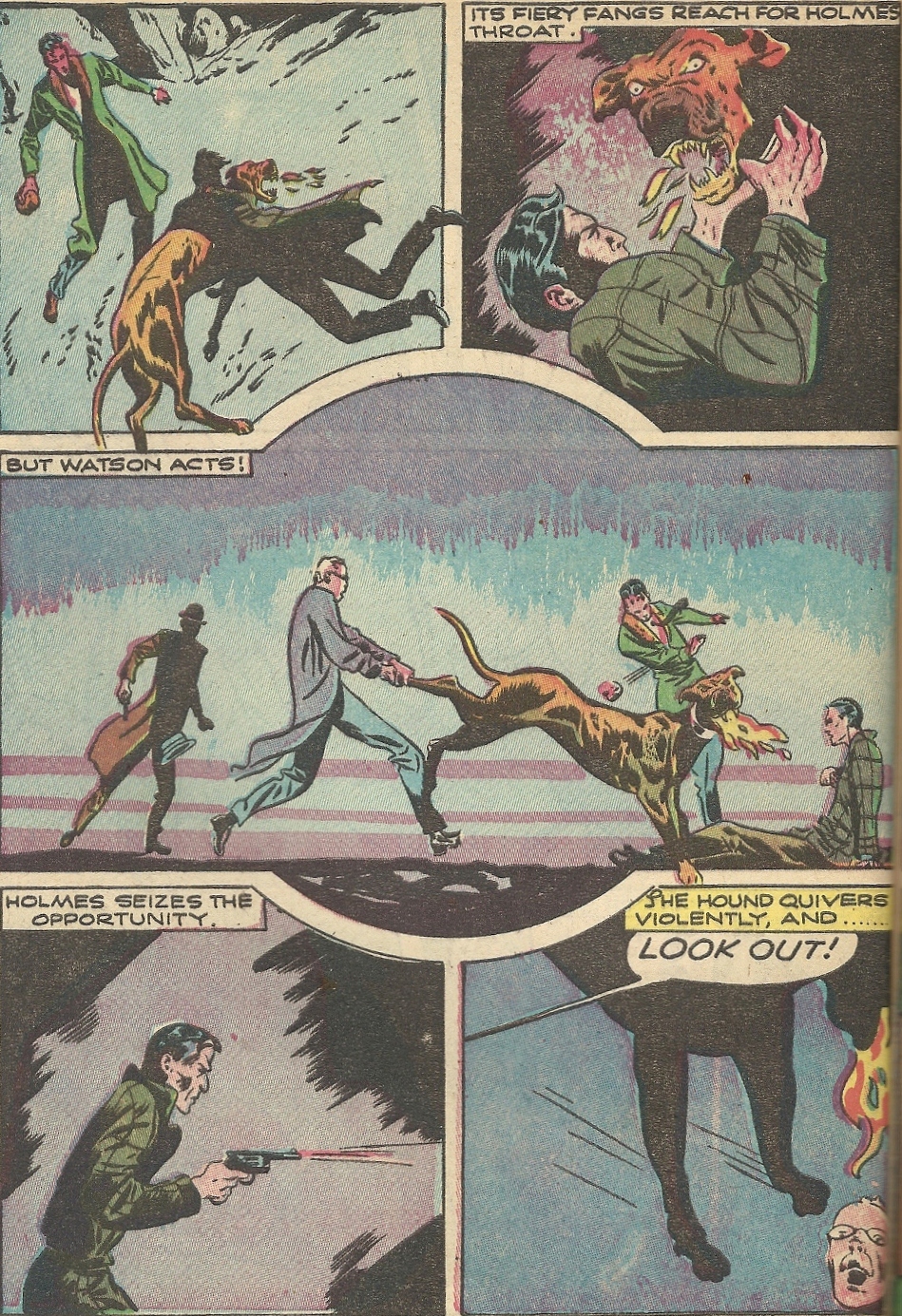 I very much liked the layout of the action in this page, as Holmes and his companions battle the eponymous hell-hound. Check out the championship-belt-shaped panel in the middle: