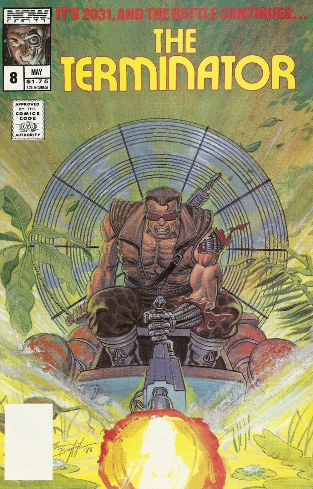 The great Norm Breyfogle, whose stupendous Batman work I once praised here, created this cover, but I was bitterly disappointed when I found that he didn’t handle the art chores inside. That, combined with the fact that Arnold and Linda Hamilton’s ripped arms are no where to be found on the inside, kept me from wading through the story. The latter is kind of a problem with all Terminator comics, I guess, but I thought that cover was cool enough to merit a quick post. Come to think of it, most of the Terminator covers from Now Comics were pretty nice.