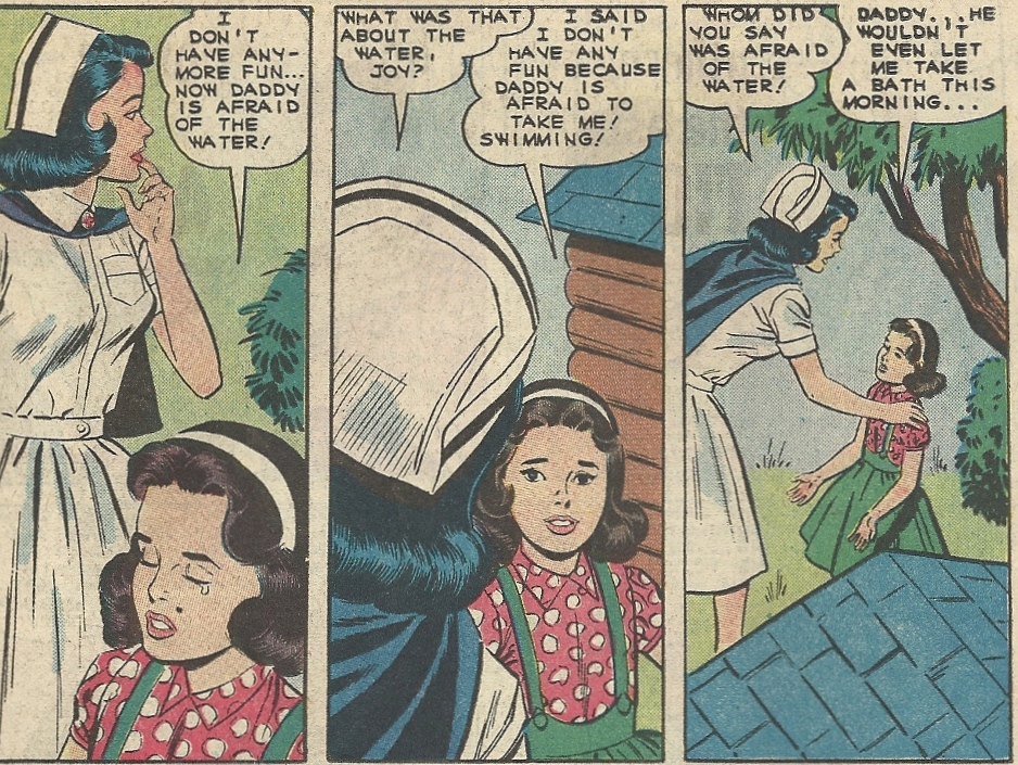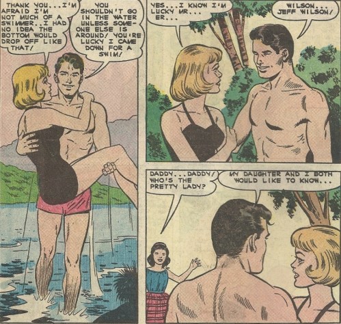 The story (with pencils from Charles Nicholas) opens with a nurse coworker of Betsy’s (Diane) out for a swim on her day off. She promptly goes into damsel in distress mode when she gets in over her head, but thankfully there’s a rugged he-man with Clark Gable shoulders around to rescue her and carry her to safety: