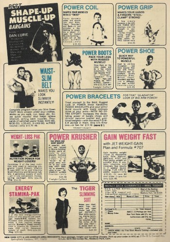 One final note on the comic — in a previous post I noted the incongruity of a fly fishing advertisment in a romance comic. This one is riddled with bodybuilding ads, common enough in regular comics but sore thumbs in this one. Here’s a whole page of them: