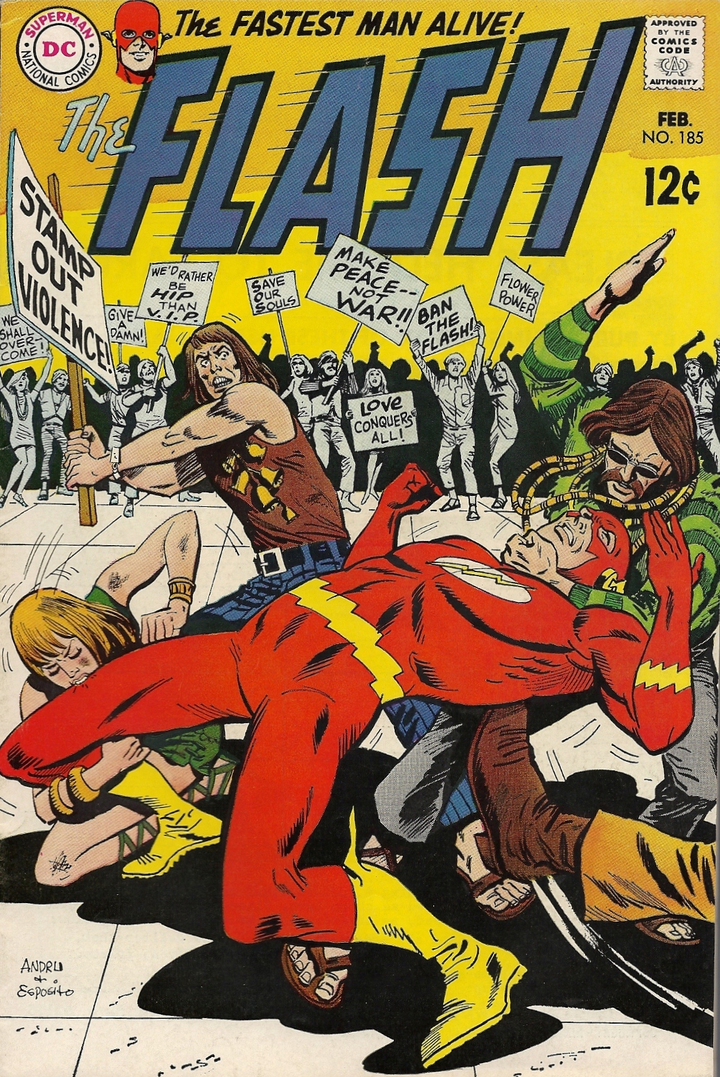 This is the first of a couple of Silver Age DC comics I plucked out that feature hippies in a less than favorable light. And by “less than favorable light” I mean “how I envision hippies all the time.” They rub me the wrong way, and seem like just the sort of folks who’d turn on a swell guy like the Flash with karate chops and leg biting. I mean, really. Who wants to be around a bunch of spaced out peaceniks with questionable hygiene who… who…