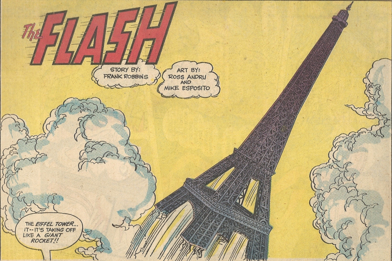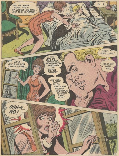 “The Threat of the High-Rise Buildings” starts with Barry Allen and that frigid bitch wife of his on their second honeymoon in Paris. You’d think that Iris might tone down her frosty, holier than thou attitude in la ville lumière, but nooooo:
