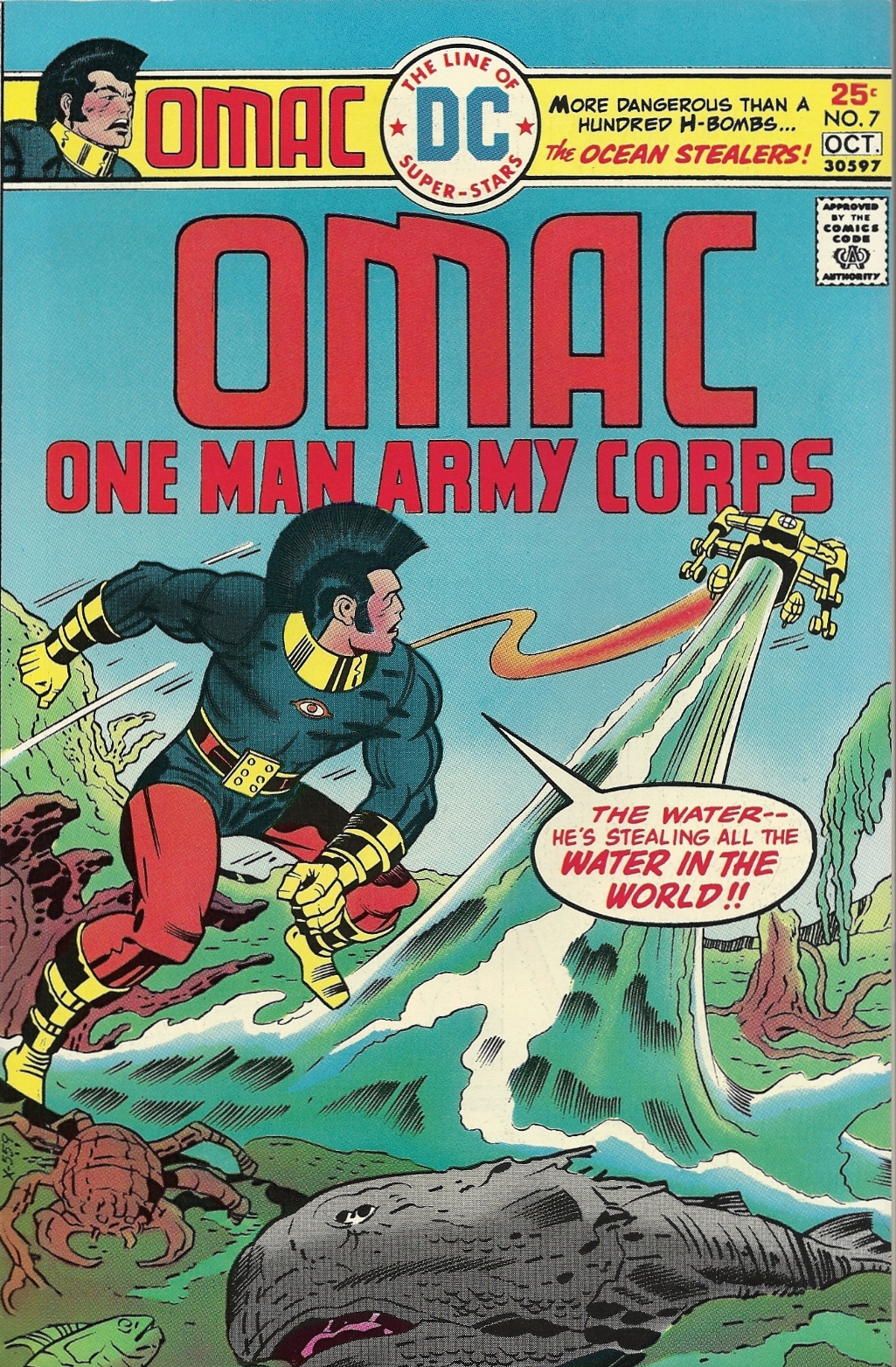 I like OMAC. The old OMAC, not the re-imagined cyborgs that showed up a few years ago to plague the heroes of the DC Universe. He was Kirby’s future version of Captain America, drawing his strength not from a serum but Matrix-style from a literal (Brother) Eye in the sky. Who needs a single Super Soldier when you can have a real honest-to-goodness One Man Army Corps? There was a straight-ahead, unadorned quality to the character that I still find appealing.