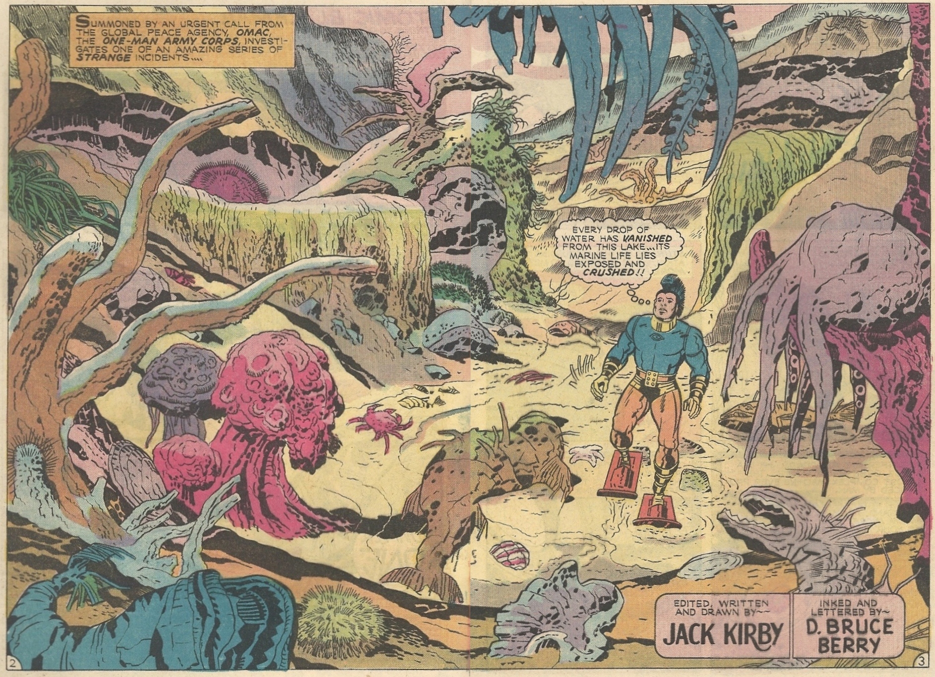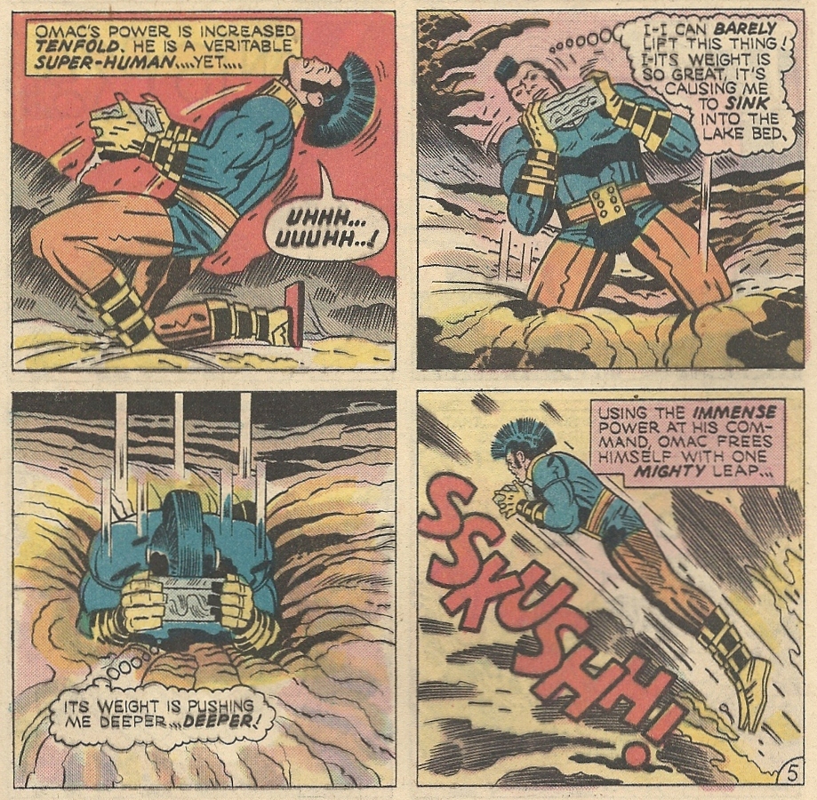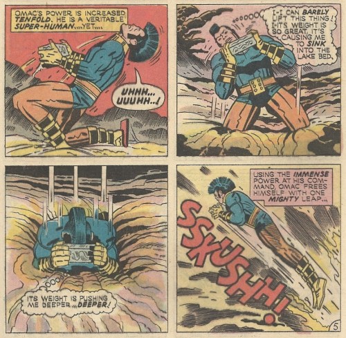 While he’s wandering around the dried lakebed he stumbles across a strange looking metal bar. When he tries to lift it he can’t, and it takes a boost from Brother Eye for him to finally heft it — and Kirby makes us feel every ounce of the effort, putting us right in OMAC’s (snow)shoes:
