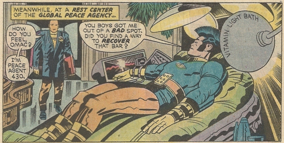 When OMAC goes after the bug-eyed Doctor Skuba (and his strangely normal and utterly useless daughter and her boyfriend), the baddie blasts him with a ray that takes away his evolved powers: