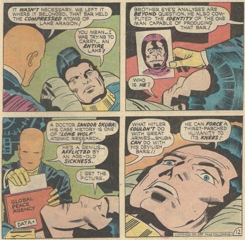 My enthusiasm for Kirby’s 1970’s DC work isn’t at the level of many’s. Jack could be ham-fisted when he was scripting, but I’ve always like the energy of the efforts and the goofy tableaus he’d put his characters into. I’d say this ish gamely represents that, with oceans condensed into metal bars and vitamin rays aplenty.