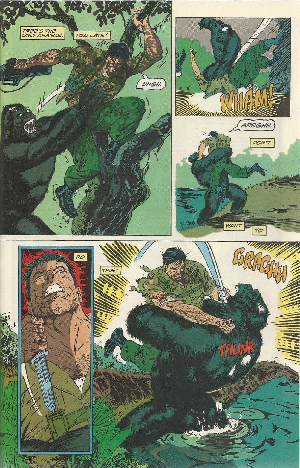 The poachers actually glom onto the research mission, and in moments when they can steal away they massacre whatever rare endangered animals are within arm’s (or bullet’s) reach, including gorillas. When Big Pun starts to figure out that something is going on and heads out into the wild to investigate, he crosses paths with a pissed off alpha male: