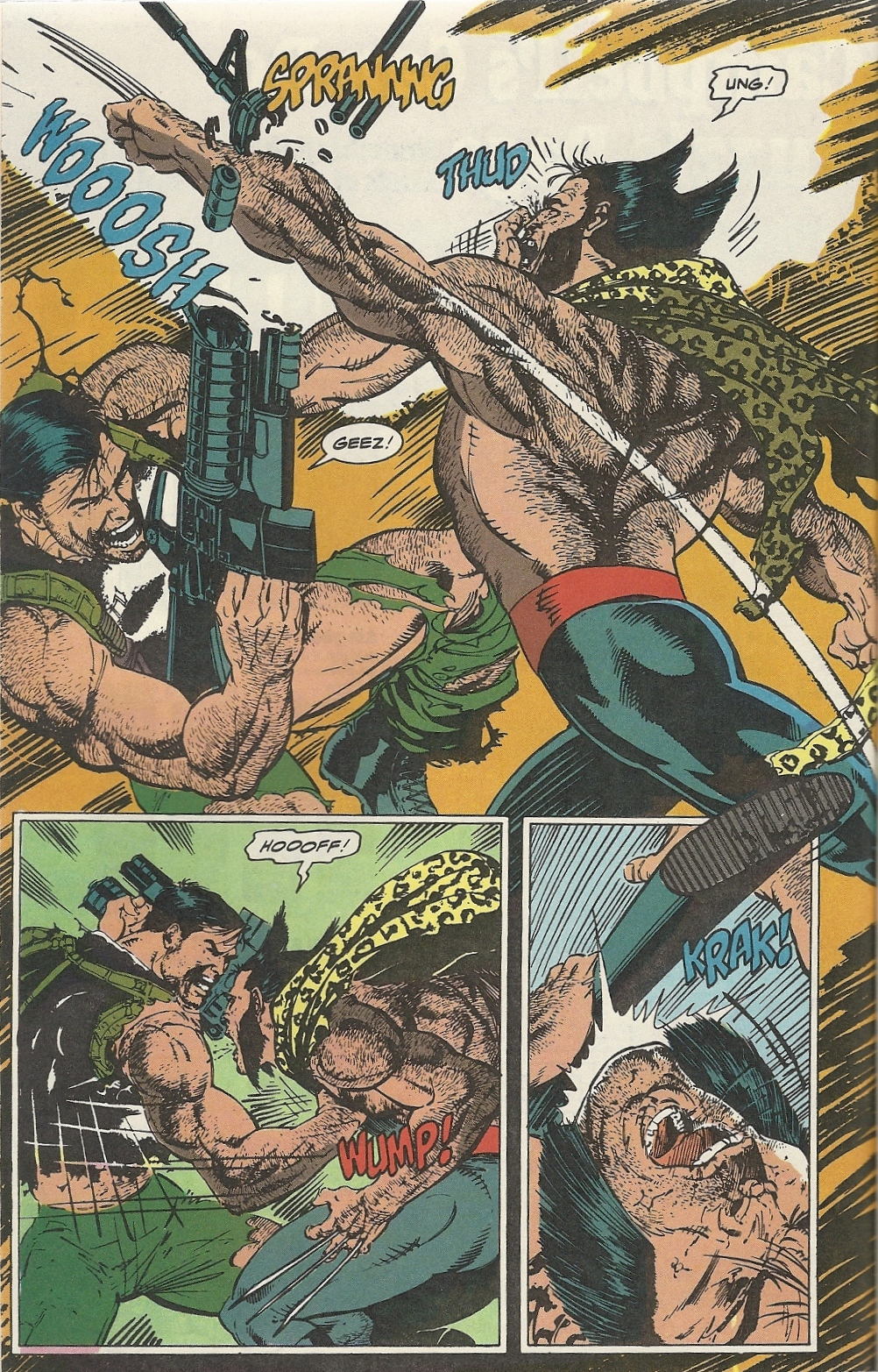 The two-parter (“On the Track of Unknown Animals” and “Endangered Species”) is written by Carl Potts, who also handled the art in collaboration with Jim Lee. The whole setup is as follows…. The Punisher is getting a little worn out, so his pal Micro convinces him to take a working vacation in Africa, guarding (under an alias) a research mission that’s trying to find living dinosaurs, the Mokele-mbembe of actual African legend. Meanwhile, Wolverine uncovers a poaching ring, gets pissed, and heads to Africa to exact his sweet revenge.