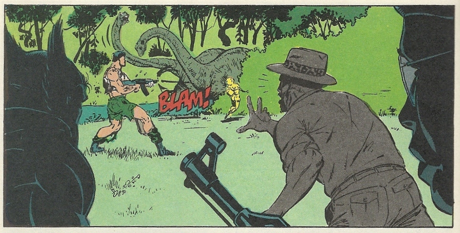 I actually sort of enjoyed these stories, even if the plot is ripped from a William Katt and Sean Young starring bit of tripe called Baby: Secret of the Lost Legend. These two guys allying to go after poachers (dino-poachers, no less) is a cause I can’t help but get behind. It’s not enough to raise them on my depth chart — all things being equal, there are many, many characters that I’d rather read about before settling for them, in much the same way a lot of people have to become incapacitated in the Presidential succession before the Secretary of Agriculture becomes Chief Executive. But I guess I’m softening as I age.
