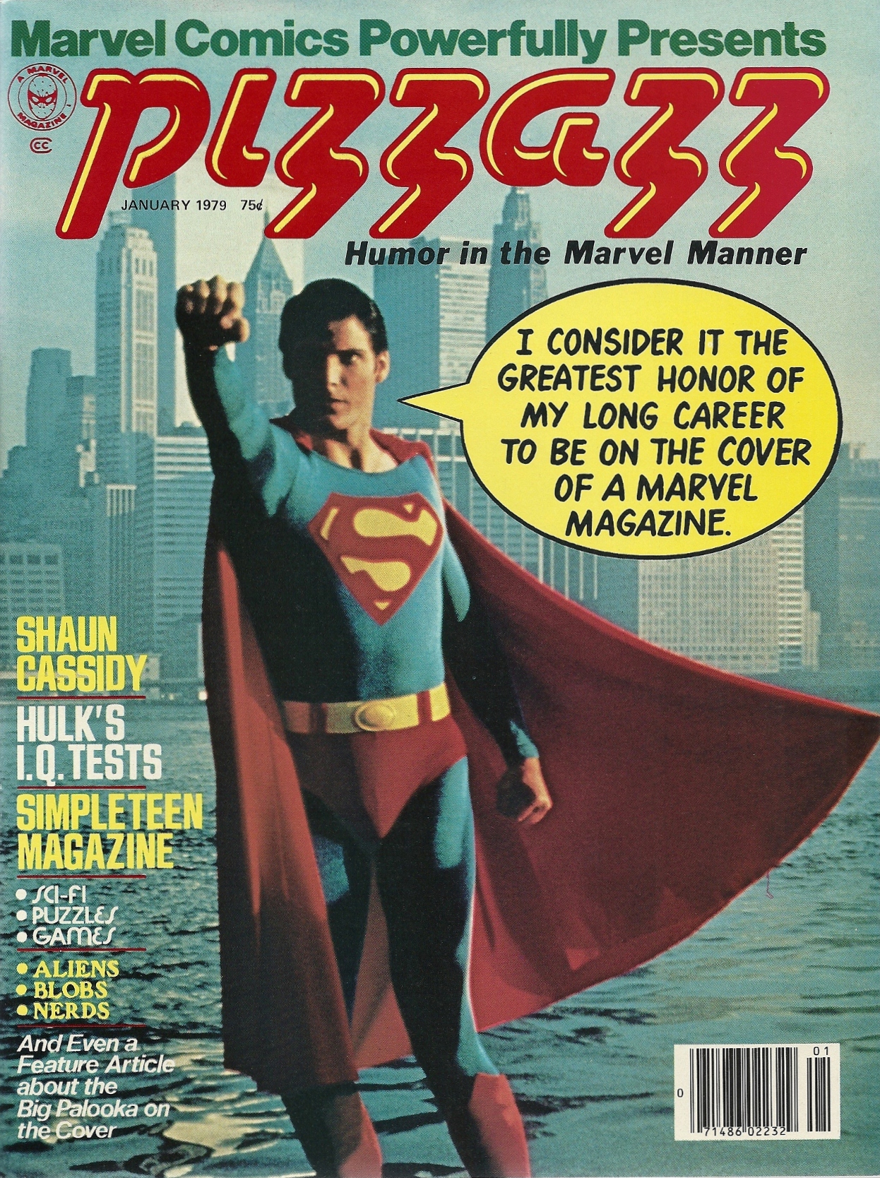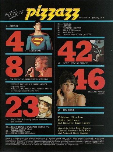 I had never heard of Pizzazz until I saw a few of them in a box of magazines a couple of months back. From what I can gather it was Marvel’s lame attempt at crossing Mad Magazine, Tiger Beat and Starlog, hence the “humor” aspects combining with nerdy movie stories and the celebritology of the day, including de rigueur profiles of someone named “Cassidy” and the like. The mag also contained serialized Star Wars stories, which may be the only feature that gives it any collectible staying power.