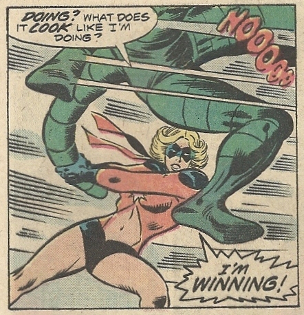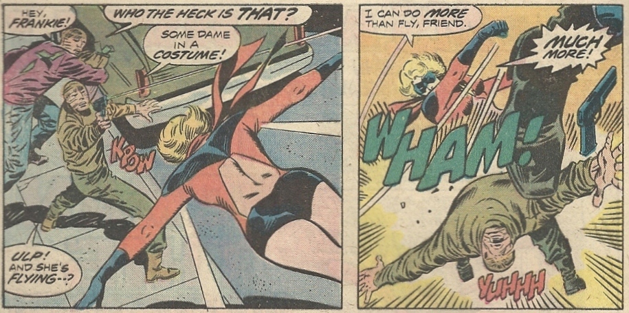 I’m more familiar with Ms. Marvel’s later hot as Hades outfit, the one with the thigh high boots and the clinging top, not this earliest bastardized version of the original Captain Marvel’s garb. While this one doesn’t stack up (though Ms. Marvel is, like most superheroines, stacked), I will doff my cap to the significant amount of back that it shows: