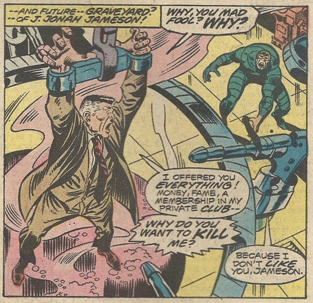 Mary Jane and Carol head off for a gab-fest, and Jonah gets his acerbic ass kidnapped by the Scorpion. After he strings up the most loathed publisher in history, the Scorpion offers what is perhaps the simplest but most persuasive rationale I’ve ever heard for wanting to kill that cigar-chomping dolt: