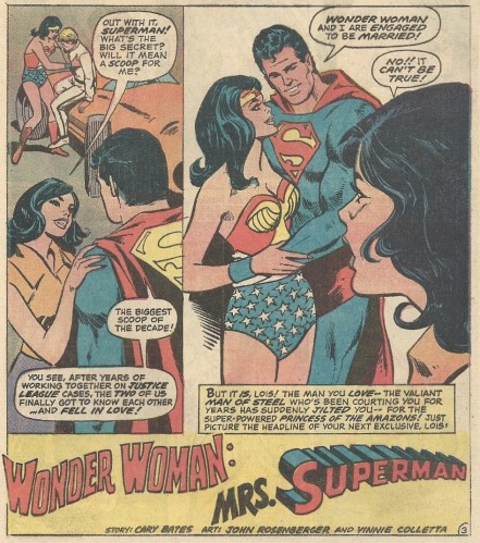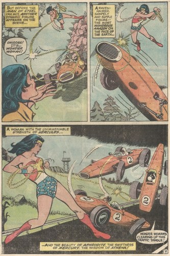 The heartache hits pretty early on in “Wonder Woman: Mrs. Superman,” written by Cary Bates with art from John Rosenberger and Vince Colletta. When things go haywire at a race car test drive that Lois is covering (she must’ve drawn the short straw at the Planet), Wonder Woman makes a quick save and shows her assets in the process:
