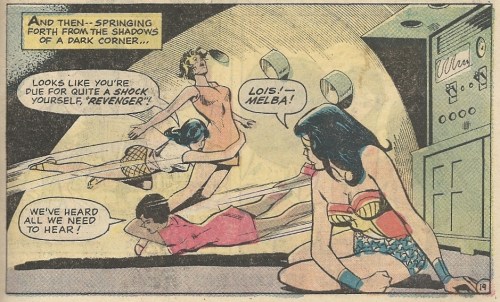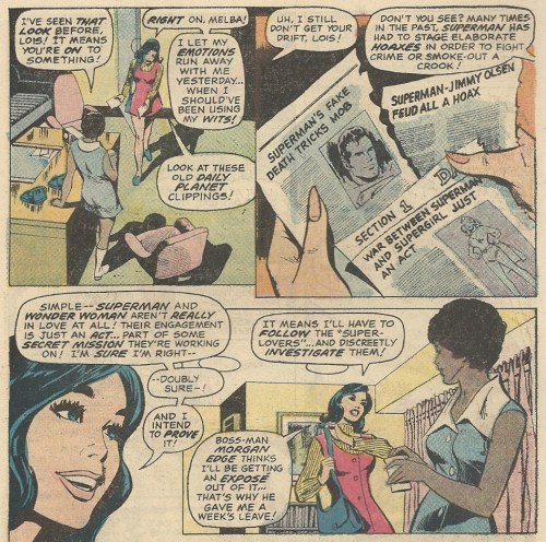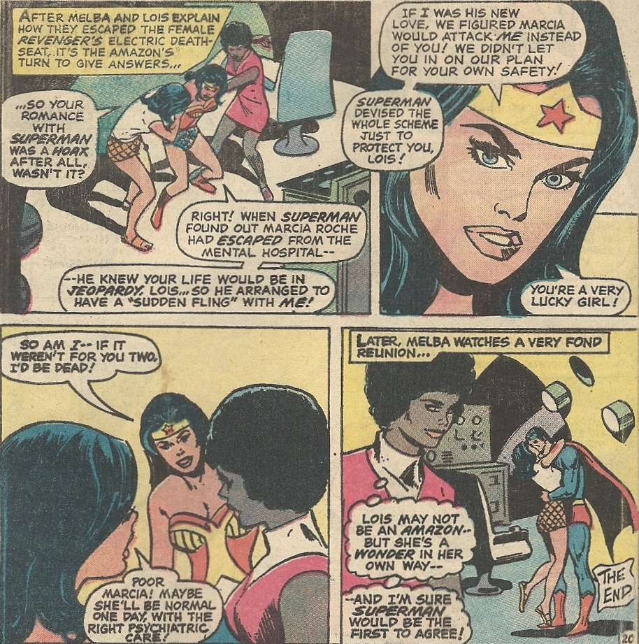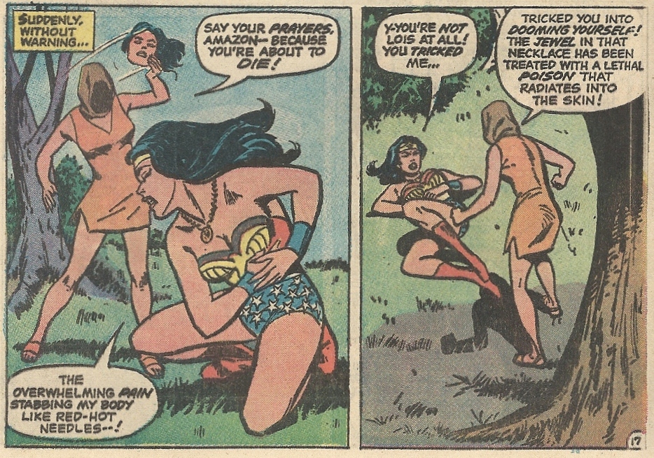 Soon we learn that things aren’t (surprise) what they seem. Lois is abducted by a hooded villain, one that wants to inflict grievous harm on Superman and his lady love, that lady love currently being Wonder Woman. Lois makes an escape from this mysterious figure’s lair with the timely help of Melba, but not in time to save Wonder Woman from being trapped by a sinister ruse — that hooded figure, masquerading as Lois, gives the Amazon a deadly bit of jewelry: