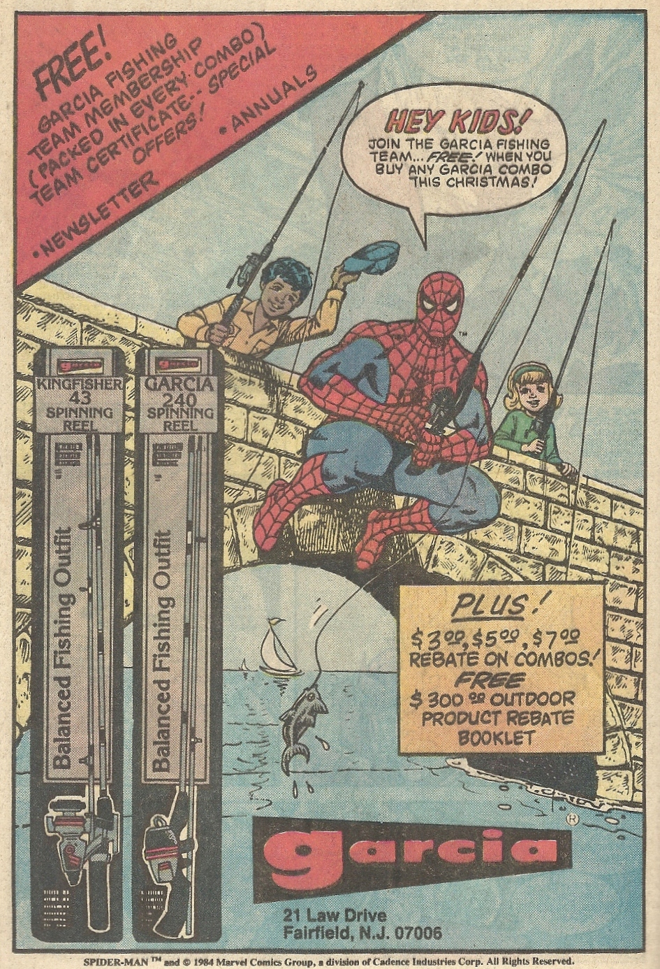 I’m not much for fishing, or for being part of the (ugh) “Garcia Fishing Team,” but I wouldn’t mind — if I was a kid again — spending a few hours working the rod and the reel with Spider-Man. I dig how he fishes like a Spider-Man should, with his feet stuck to the side of the bridge.