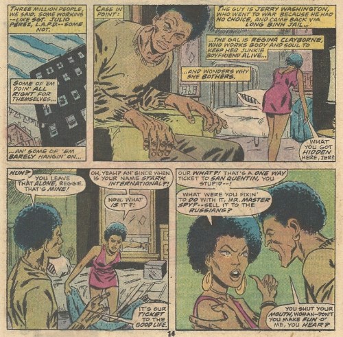“Enter Stilt Man — Exit Black Goliath,” written by Chris Claremont with art from Rich Buckler and Don Heck (and a cover featuring the distinctive flat-tipped fingers of Jack Kirby), doesn’t quite rise to the level of Blaxploitation, but it has its moments. In case that “up out of the ghetto” stuff needs some reinforcement, we early on get the stock low-life black characters — the strung out punk and his girlfriend straight out of racial stereotype central casting: