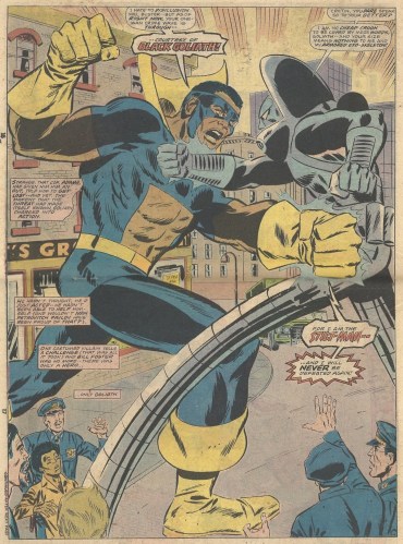 Black Goliath, with his 70s-era prominent collar, is yet another in that long line of African-American heroes to have their skin color emblazoned in their names. I cringe every time I see that old trope, but it’s an unavoidable part of comics’ evolution. For this particular hero, here’s the opening blurb from this issue to give you his gist if you’re not familiar: