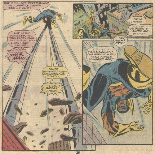 Blessedly, we’re not subjected to much of that. The bulk of the action is centered around a meaner, nastier Stilt-Man, whose robbery of a bank (I appreciate how he always sets his sights low) brings out Black Goliath to stop him. Now, don’t get me wrong, I don’t have any beef with the Stilty, and I always take pleasure in the opportunities his suit provides for artists to flex their perspective muscles. But he’s also always struck me as a perhaps one of the “whitest” of Marvel villainy’s lower rungs. A stiff. Think about it — no self-respecting brother, Asian, Latino, Martian or whatever would be caught dead in that suit. He’s Whitey McWhite-White. And I say that as a stiff white man.