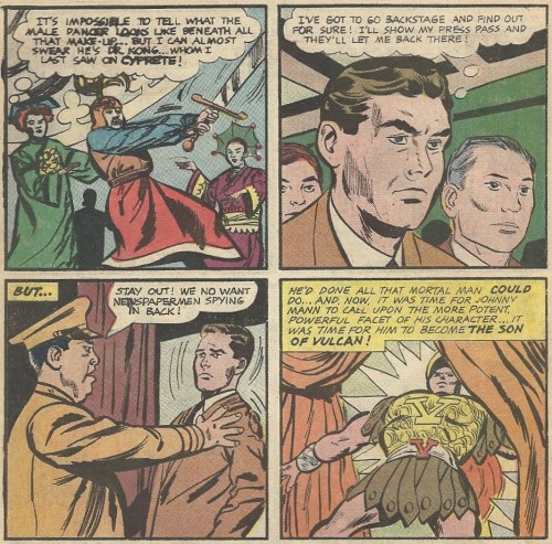 “The Diamond Dancers” was scripted by Joe Gill and illustrated by Bill Fraccio and Tony Tallarico, and, in a footnote, this was the first issue of Son of Vulcan as an eponymous book. Before the series had been entitled Mysteries of Unexplored Worlds, and with this installment our hero shucked off his old environs in much the same way that Thor got rid of the Journey into Mystery label with issue #126. Also, Dave Cockrum designed SoV’s new look costume (per the notation on the cover).